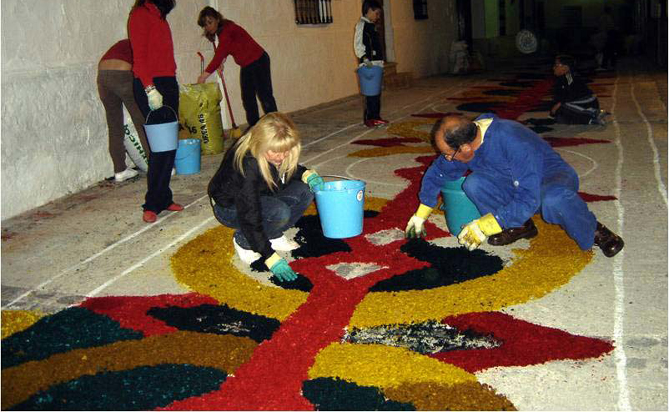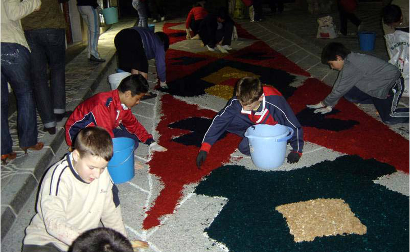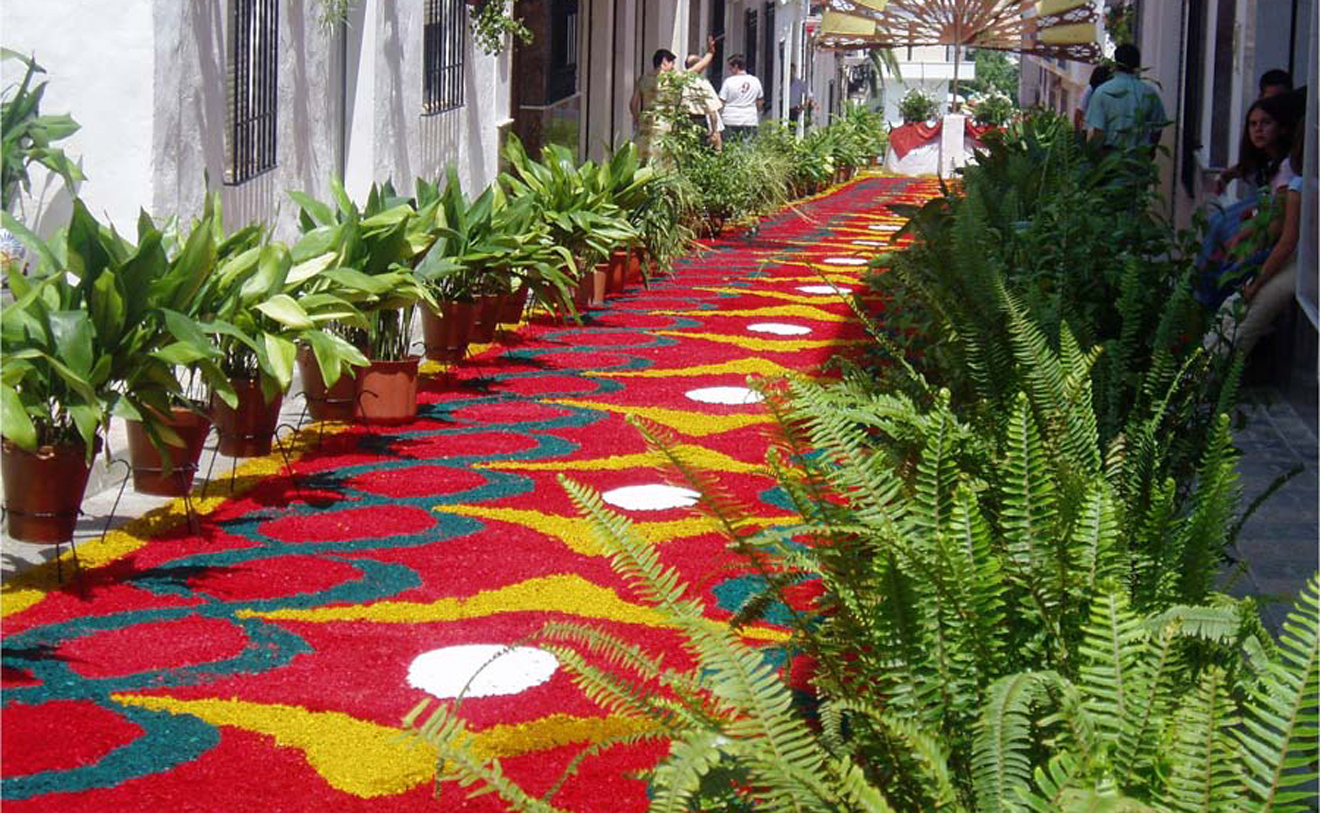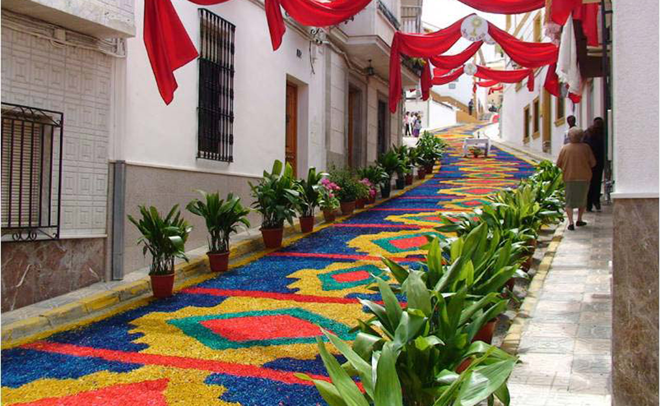 Se celebra el domingo siguiente al jueves de Corpus, transformando las calles del municipio en un espectáculo de color y devoción. Los vecinos elaboran alfombras de serrín teñido con diseños geométricos y florales, que se extienden a lo largo de aproximadamente 2 km. Estas alfombras, junto con macetas, altares y balcones engalanados con mantones y colchas, adornan el recorrido de la procesión de la Custodia, una pieza de plata del siglo XVIII. La preparación comienza días antes, y en la madrugada del sábado al domingo, la comunidad se reúne para colocar el serrín, culminando con una chocolatada. El domingo por la tarde, la procesión recorre las calles decoradas, acompañada por la banda de música Ciudad de Porcuna.